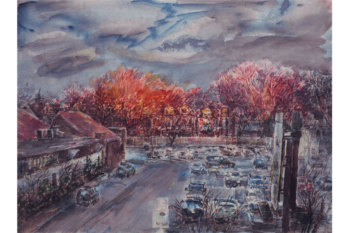 MARCO SASSONE, CARLAW PARKING LOT, 2011, WATERCOLOUR ON PAPER, 21 X 28.5 INCHES