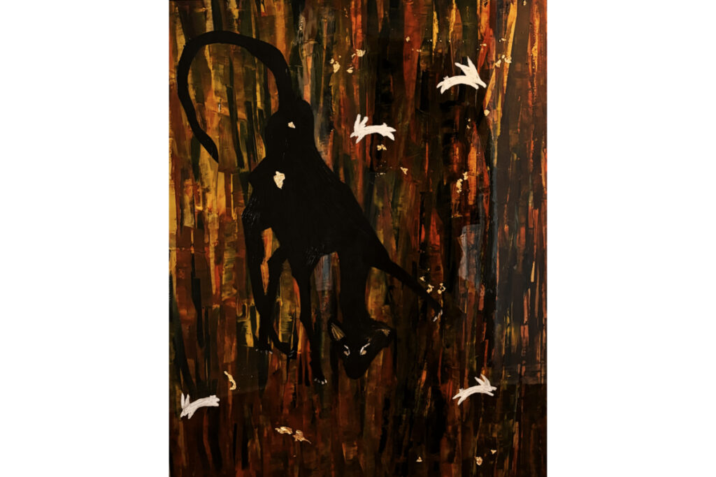 Da Silva Maia has held on tightly to his Brazilian roots, mixed with patchwork memories from a childhood spent in the countryside, both in England and the Canadian Prairies. Now, as a self-taught artist, he finds himself drawn to some favourite literary motifs as a starting point for his paintings; and many of these have carried through from his childhood. The velveteen rabbit of Margery Williams’ story and the bunnies of Watership Down bring with them the dichotomies of childhood; a stage in life marked by both danger and comfort. Alexandre Da Silva Maia is interested in re-piecing the puzzle of his memories and the mystique of nature. His paintings play with a lens which magnifies an interaction between magical realism and abstraction, the artificiality of ornamental, baroque stylings of rustic and familiar landscapes. This universe is created, becomes “real” through his painting with resin application.